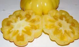 В технической спелости томаты зеленые с характерным темно-зеленым пятном у плодоножки. При полном созревании они приобретают равномерный теплый желтый цвет, заявленный в характеристиках сорта. Мякоть очень плотная, сахаристая на изломе, мясистая, с насыщенным сладким вкусом и легкой фруктовой ноткой.