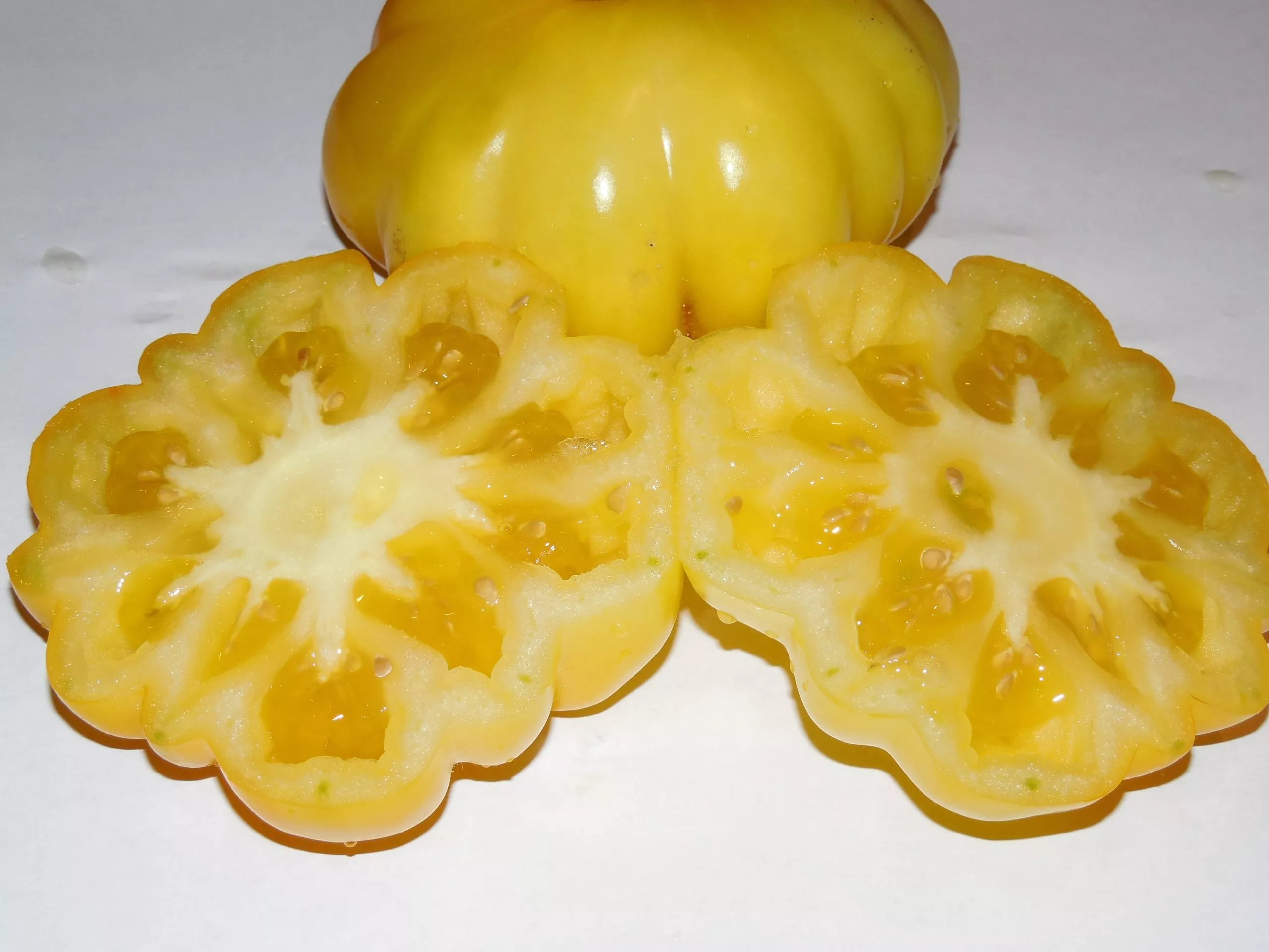 В технической спелости томаты зеленые с характерным темно-зеленым пятном у плодоножки. При полном созревании они приобретают равномерный теплый желтый цвет, заявленный в характеристиках сорта. Мякоть очень плотная, сахаристая на изломе, мясистая, с насыщенным сладким вкусом и легкой фруктовой ноткой.
