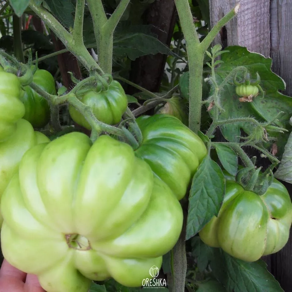 Главная отличительная черта — плоды. Их форма плоско-округлая, но главное — ярко выраженная, глубокая ребристость, которая часто создает сложный «цветочный» узор. Ребра проходят от плодоножки до основания, делая каждый томат уникальным. Плоды многокамерные, с малым количеством семян.