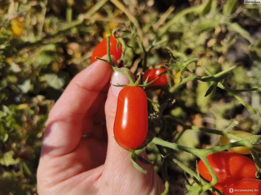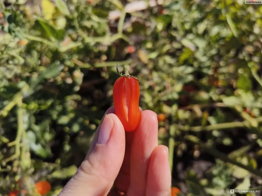 Плоды формируются в кистях, обычно по 6-10 штук. Их главная отличительная черта — эллиптическая форма, иногда с легким заострением на кончике, напоминающая изящные пальцы. Средняя масса одного томата составляет 20-30 граммов, что обеспечивает выровненность в кисти.