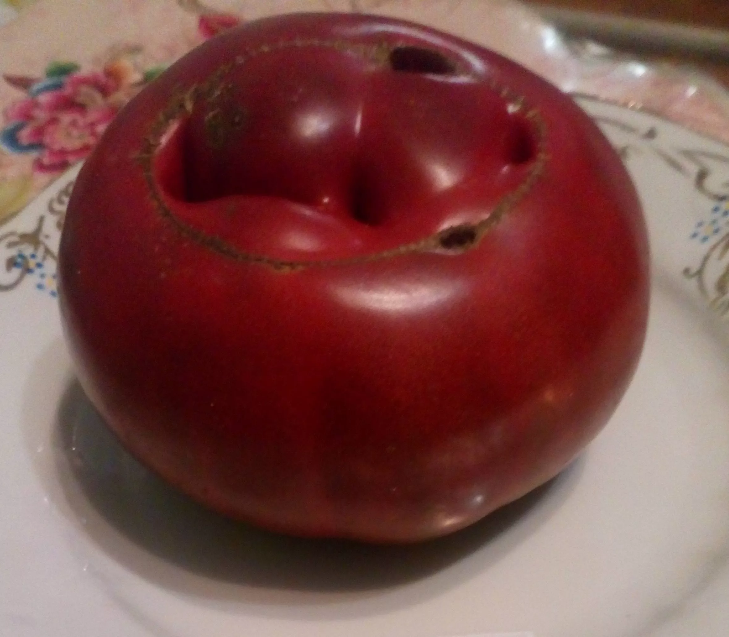 Плоды обладают характерной плоскоокруглой формой и уникальной окраской — зрелый томат имеет насыщенный коричнево-красный или коричнево-бордовый цвет. Такой оттенок свидетельствует о наличии антоцианов, природных пигментов с антиоксидантными свойствами.