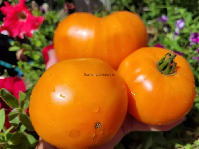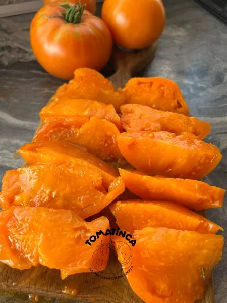 Сорт демонстрирует редкое для крупноплодных форм сочетание характеристик. От «бифштексных» томатов он унаследовал массивные, мясистые плоды массой 300-500 граммов, но при этом приобрел насыщенную оранжевую окраску и десертный вкус с фруктовыми нотками. Такая комбинация делает его универсальным: плоды подходят и для свежего потребления, и для переработки на сок или соусы, которые получаются не только вкусными, но и обладают красивым золотистым цветом.