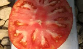 Плоды имеют классическую плоскоокруглую форму, часто с выраженной ребристостью в области плодоножки. Эта ребристость — характерный сортовой признак, который становится заметнее у самых крупных экземпляров. Мякоть многокамерная, очень плотная и мясистая, с небольшим количеством семян. На изломе она сахаристая, что прямо указывает на высокое содержание сухих веществ и сахаров.