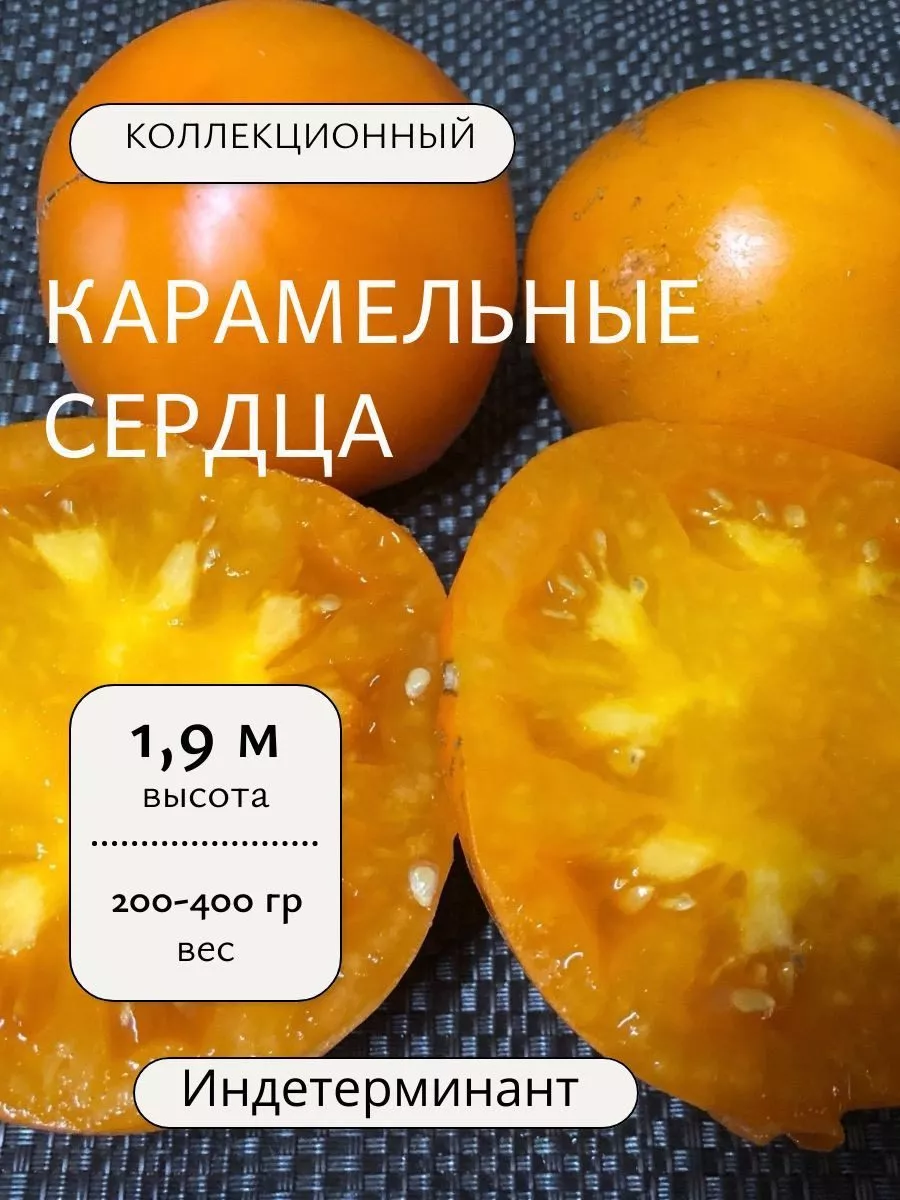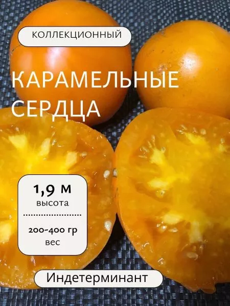 Название «Карамельные сердца» может вызывать ассоциации с мелкими плодами, но этот сорт приятно удивляет. Его томаты массивные, весом от 200 до 400 граммов. Форма не классически сердцевидная, а плоскоокруглая, часто с выраженной ребристостью у плодоножки, что придает им особый шарм и узнаваемость.