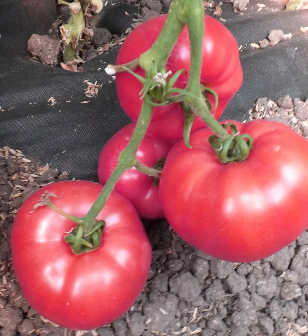 Плоды — ключевая отличительная черта гибрида. Они имеют классическую плоскоокруглую форму, заметно приплюснутую сверху и снизу, со слабовыраженной ребристостью в области плодоножки. В биологической спелости томаты приобретают равномерный, насыщенный розовый цвет без зеленого или желтого пятна у основания.