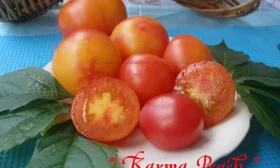Появление томата Карма абрикосовая стало ответом на растущий интерес к биколорным (двуцветным) и фруктовым томатам. Селекционеры стремились получить сорт, сочетающий декоративность с практической пользой, что полностью отражено в его названии. Первая часть, «Карма», подчеркивает особую притягательность и баланс качеств, а вторая, «абрикосовая», точно описывает основной окрас плодов с характерными красными румянами.