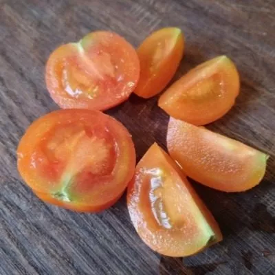 Кожица плотная, но не жесткая, что обеспечивает хорошую транспортабельность и устойчивость к растрескиванию. Мякоть сочная, сахаристая на изломе. Вкус десертный, сладкий, с едва уловимой фруктовой ноткой и минимальной кислотностью, что характерно для многих оранжевоплодных томатов.