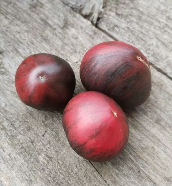 Мякоть мясистая, плотная и многокамерная, с небольшим количеством семян. На разрезе часто видна та же игра цветов — розовая мякоть с более темными участками у кожицы в местах прохождения внешних антоциановых полос. Такая особенность делает плоды необычными не только снаружи, но и внутри.