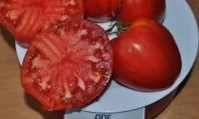 По типу мякоти сорт относится к категории биф-томатов (от английского «beef» — говядина). Это означает, что плоды отличаются исключительной мясистостью и высокой плотностью. На разрезе видно, что семенных камер очень мало, они небольшие и заполнены незначительным количеством желеобразной массы с семенами. Основной объем плода, который может достигать 200-300 граммов, занимает однородная, сахаристая на изломе мякоть.