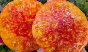 В стадии полной биологической зрелости основной фон кожицы становится насыщенно-оранжевым, а на нем проявляются малиновые разводы и полосы. Такой мраморный или перламутровый эффект непредсказуем, и рисунок на каждом томате индивидуален. Окрашивание происходит неравномерно, часто начинаясь с внутренней части плода.