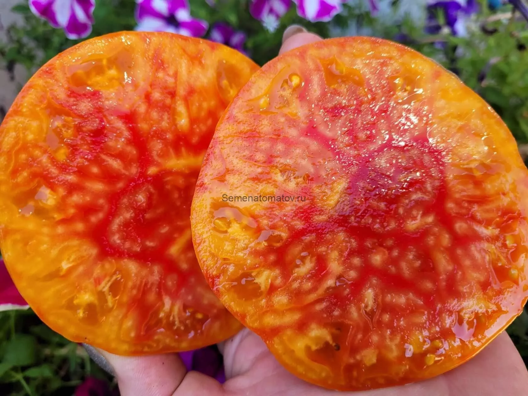 В стадии полной биологической зрелости основной фон кожицы становится насыщенно-оранжевым, а на нем проявляются малиновые разводы и полосы. Такой мраморный или перламутровый эффект непредсказуем, и рисунок на каждом томате индивидуален. Окрашивание происходит неравномерно, часто начинаясь с внутренней части плода.