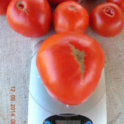 Форма плодов округло-плоская, с хорошо заметной ребристостью, особенно у плодоножки. В состоянии полной биологической спелости томаты приобретают насыщенный красно-малиновый цвет. Кожица у них тонкая, что является общей чертой многих крупноплодных сортов, но при этом обладает достаточной плотностью, чтобы удерживать сочную мякоть.