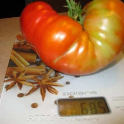 Главная отличительная черта этого сорта — его плоды, которые полностью оправдывают название. Их основная особенность — крупный размер и характерная для биф-томатов (крупноплодных мясистых сортов) структура мякоти. Средняя масса соответствует заявленным 550 граммам, но на практике нижние кисти часто формируют настоящих гигантов.