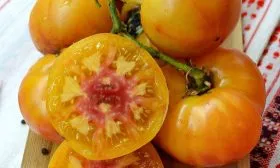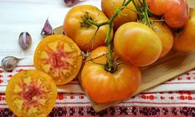 Мякоть соответствует типу биф-томатов: она плотная, мясистая и сахаристая на изломе. Плоды многокамерные, с небольшими семенными камерами и незначительным количеством семян. Такая структура обеспечивает не только выдающиеся вкусовые качества, но и влияет на поведение плода при переработке: мякоть дает густой, насыщенный сок или пюре с минимальным количеством свободной жидкости.