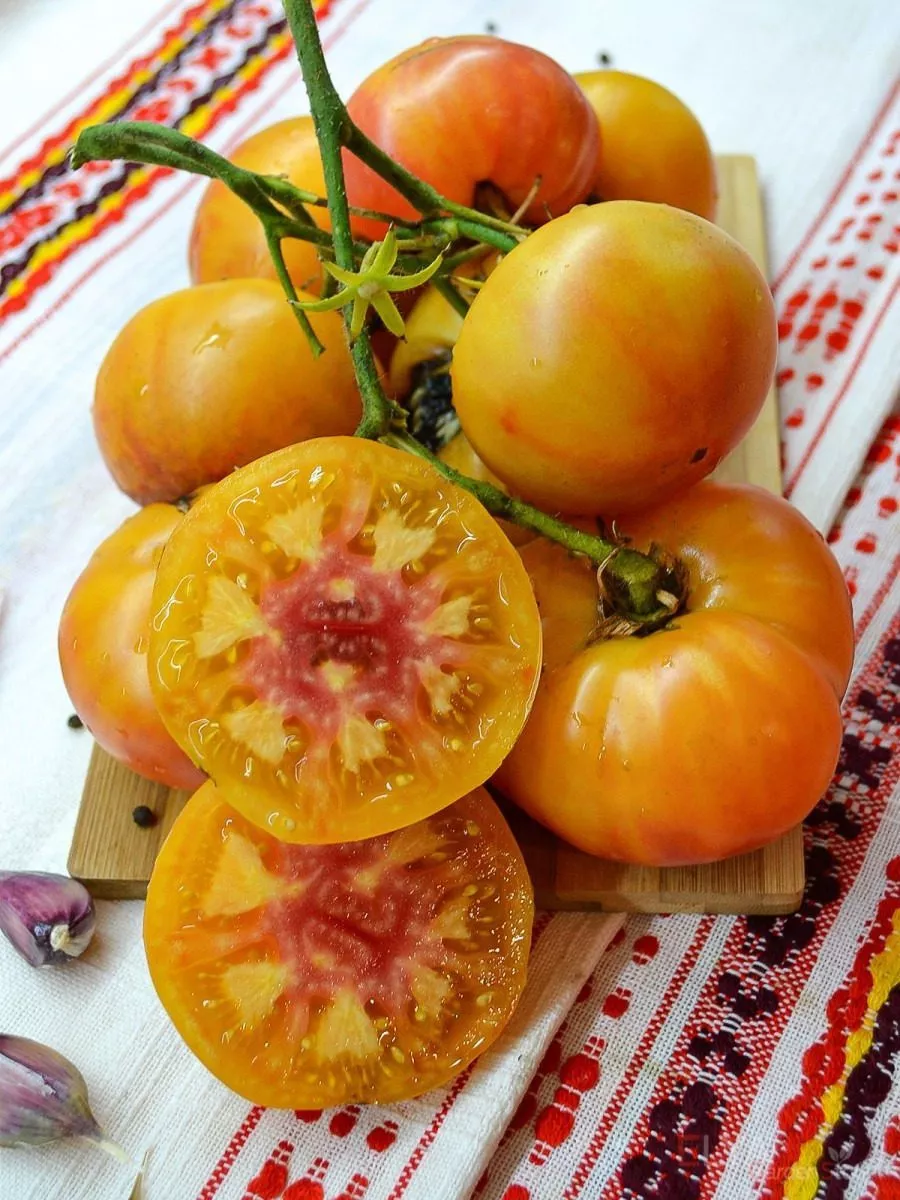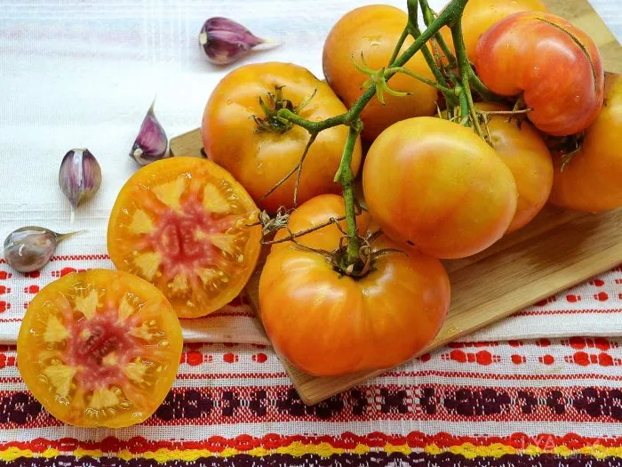 Мякоть соответствует типу биф-томатов: она плотная, мясистая и сахаристая на изломе. Плоды многокамерные, с небольшими семенными камерами и незначительным количеством семян. Такая структура обеспечивает не только выдающиеся вкусовые качества, но и влияет на поведение плода при переработке: мякоть дает густой, насыщенный сок или пюре с минимальным количеством свободной жидкости.