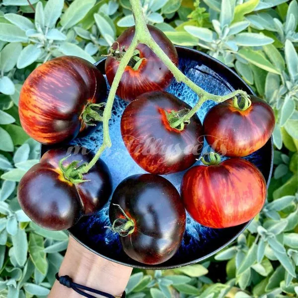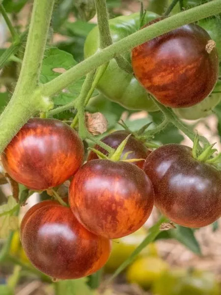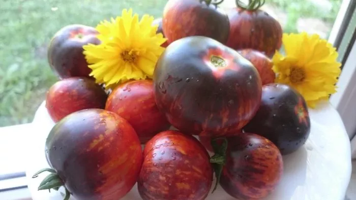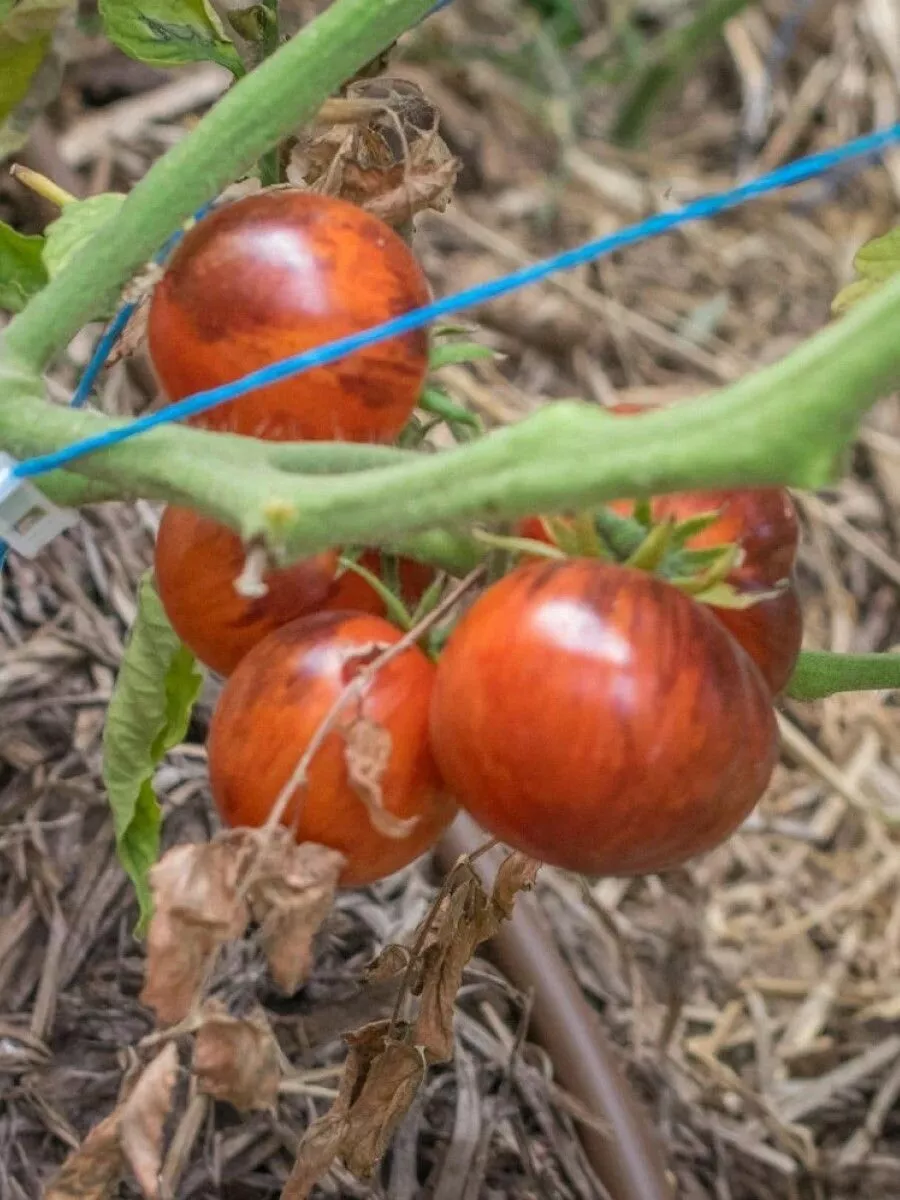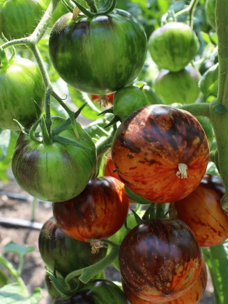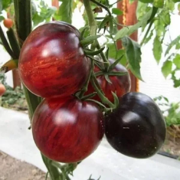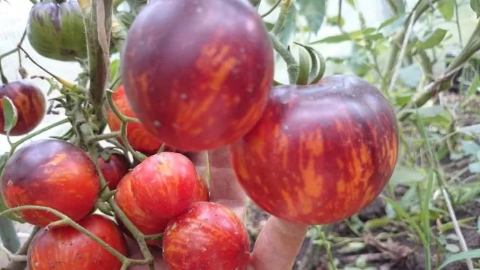 Сбор урожая проводят в стадии полной биологической зрелости, когда плоды набирают свой фирменный цвет и сладость. Именно на солнце окончательно проявляется уникальная окраска — оранжево-красный фон с пестрыми вкраплениями антоциана и темно-фиолетовыми плечиками. Снимать томаты бурыми для дозаривания в помещении можно, но это часто приводит к менее интенсивной и неравномерной окраске, а также к недобору сахаров, что сказывается на вкусе.