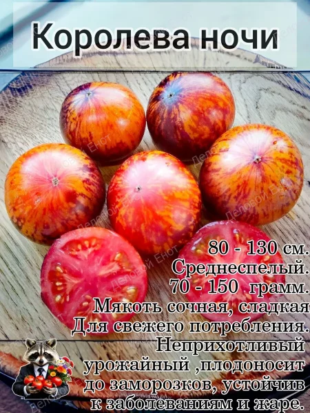 Томат Королева ночи — это сорт, чья история не уходит корнями в глубокую древность, но который заслужил внимание благодаря ярко выраженным сортовым, а не гибридным признакам. Ключевая особенность, отраженная в названии, — уникальная, «королевская» окраска плодов. В стадии полной зрелости они приобретают оранжево-красный основной фон, который контрастирует с пестрыми вкраплениями антоциана (темного пигмента) и темно-фиолетовыми плечиками у плодоножки.