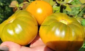 Плоды – главная гордость этого томата. Их плоскоокруглая форма часто дополняется заметной ребристостью у плодоножки, что придает им сходство со старинными помидорами или даже тыквами-чалмами. Плоды демонстрируют хорошую выравненность в кисти и не мельчают к верхушке растения.
