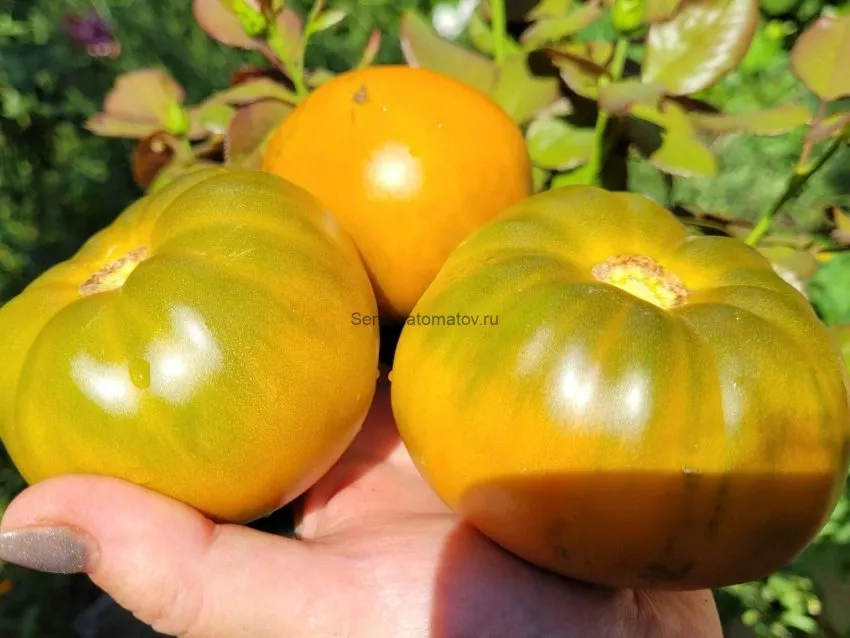 Плоды – главная гордость этого томата. Их плоскоокруглая форма часто дополняется заметной ребристостью у плодоножки, что придает им сходство со старинными помидорами или даже тыквами-чалмами. Плоды демонстрируют хорошую выравненность в кисти и не мельчают к верхушке растения.