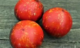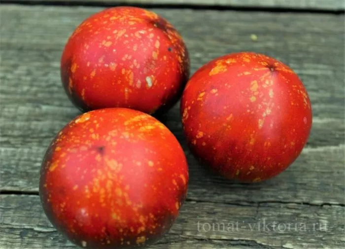Плоды округлой формы, выровненные, со средней массой 140 граммов. Их отличительный признак — насыщенный малиновый цвет в биологической спелости. Такая окраска часто связана с повышенным содержанием ликопина — полезного антиоксиданта.
