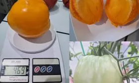 Масса является ключевым параметром: плоды стабильно превышают заявленные 1000 граммов. На нижних, первых кистях нередко формируются настоящие гиганты. Плоды многокамерные, с небольшим количеством семян. Мякоть очень сочная, мясистая и при этом нежная, сахаристая на изломе.