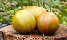 Внешний вид плодов — это визитная карточка данного сорта. Их уникальная окраска сразу выделяет его среди других томатов на грядке или в теплице. В стадии полной зрелости плоды приобретают эффектную полосатую расцветку, где сочетаются зеленые, желтые и красные тона. Этот окрас не является равномерным, а представляет собой живописные разводы и полосы, что делает каждый томат индивидуальным.