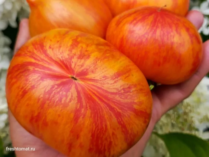 Окрас зрелых томатов — их главная декоративная черта. Цвет описывается как красно-оранжево-желтый, что на практике проявляется в сложном, переливчатом оттенке. Основной тон чаще оранжево-красный, а у плодоножки (на плечиках) нередко проявляется теплый желтый или золотистый румянец. Такой окрас говорит о высоком содержании каротиноидов.