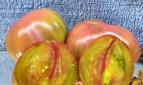 Форма плодов плоскоокруглая, часто с легкой ребристостью у плодоножки. Однако главный отличительный признак — уникальная окраска. В состоянии полной биологической спелости томаты приобретают глубокий красно-пурпурный фон, по которому расходятся тонкие зеленые полосы и штрихи. Эта пестрая расцветка — не просто декоративный элемент. Она свидетельствует о накоплении антоцианов, полезных растительных пигментов с антиоксидантными свойствами.