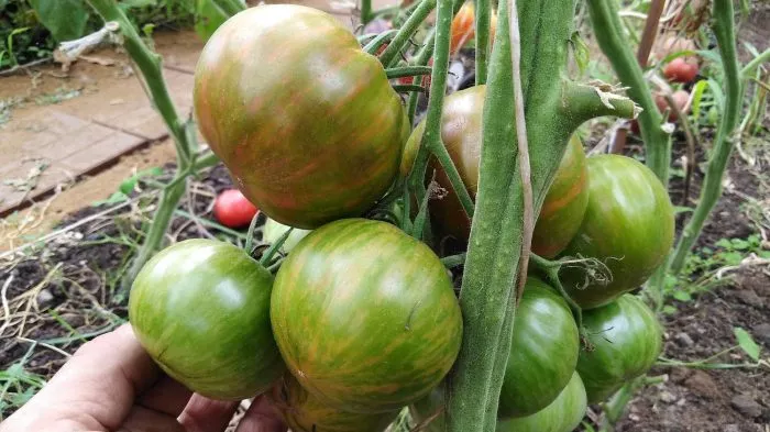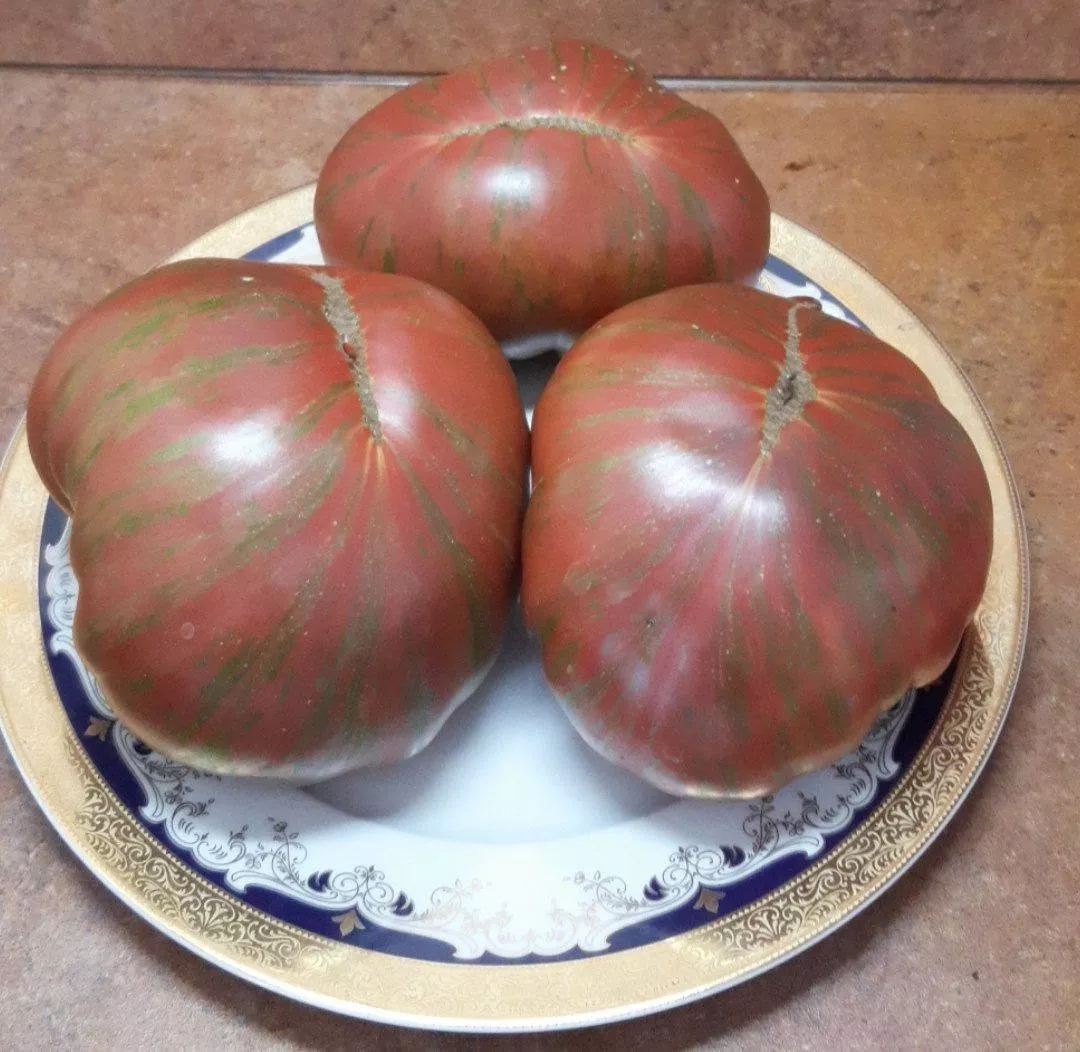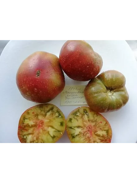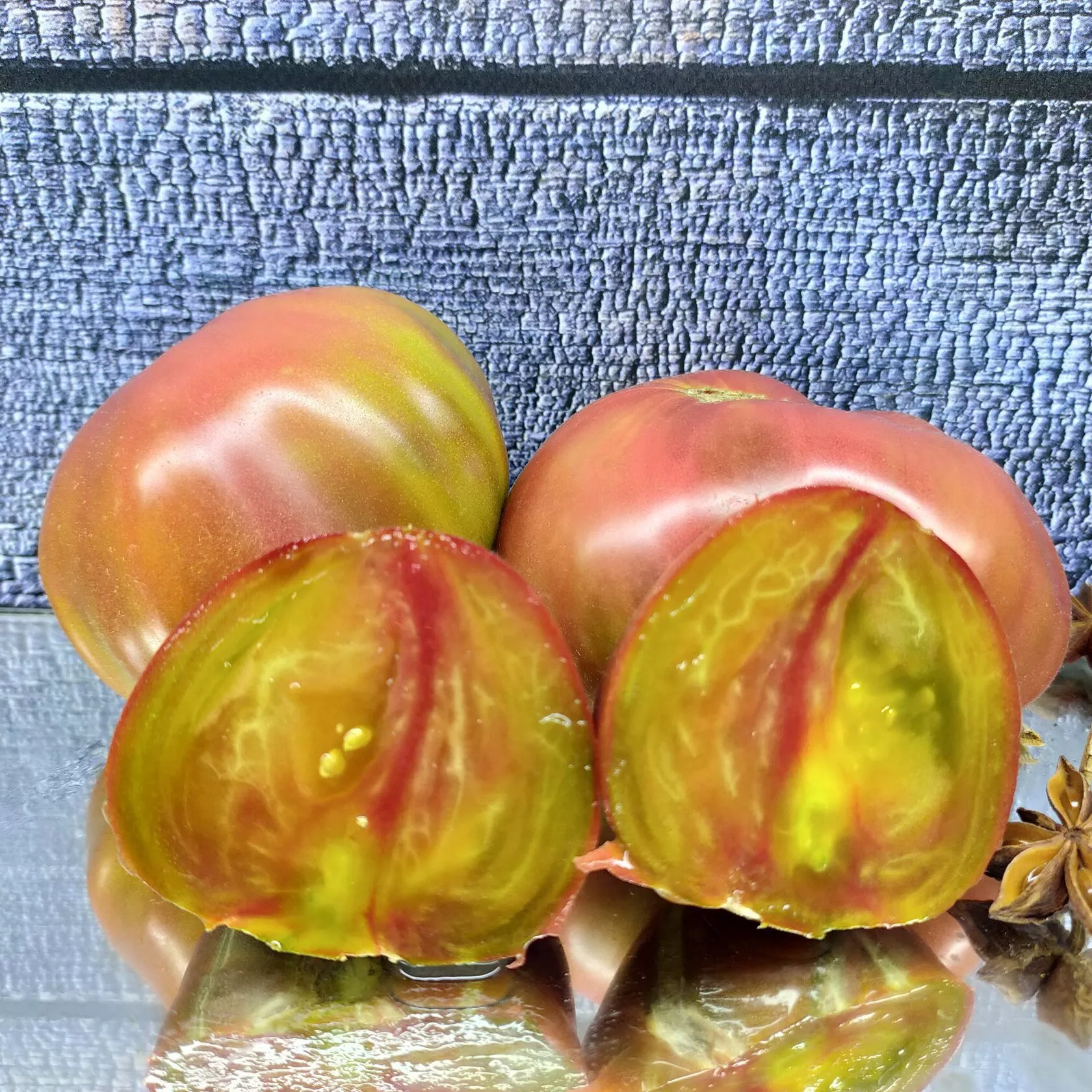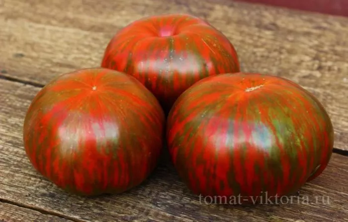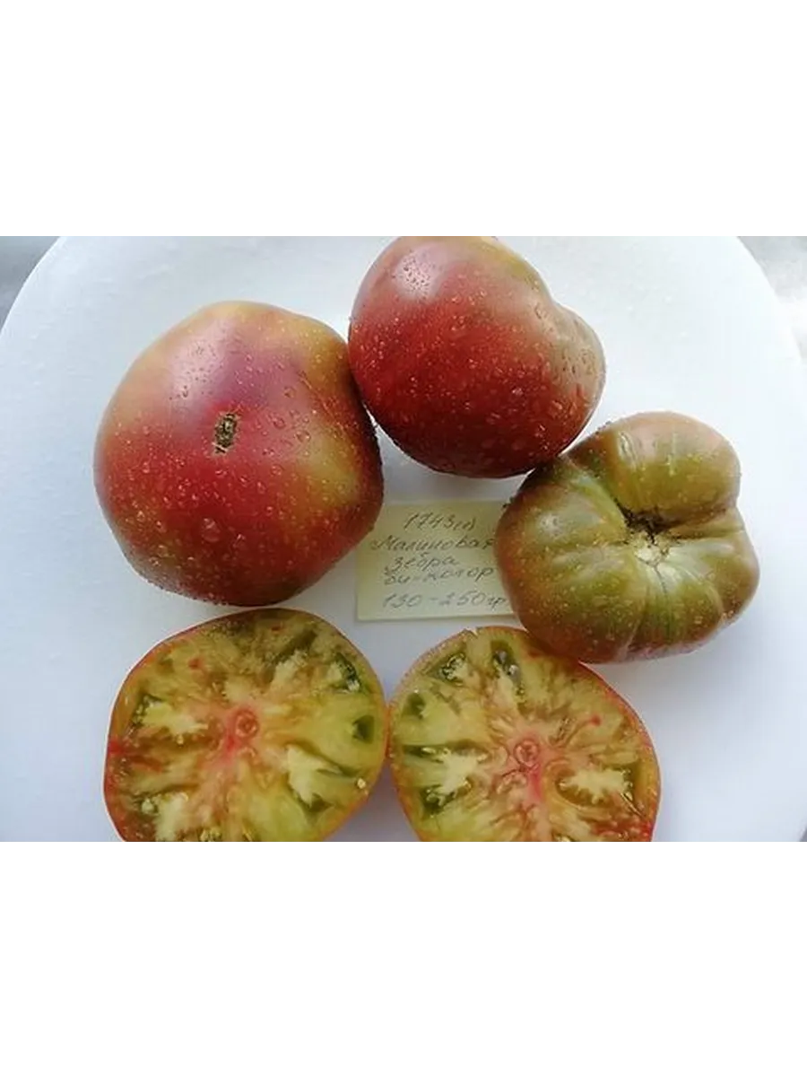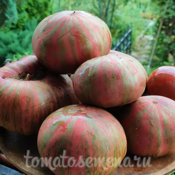 Форма плодов плоскоокруглая, часто с легкой ребристостью у плодоножки. Однако главный отличительный признак — уникальная окраска. В состоянии полной биологической спелости томаты приобретают глубокий красно-пурпурный фон, по которому расходятся тонкие зеленые полосы и штрихи. Эта пестрая расцветка — не просто декоративный элемент. Она свидетельствует о накоплении антоцианов, полезных растительных пигментов с антиоксидантными свойствами.