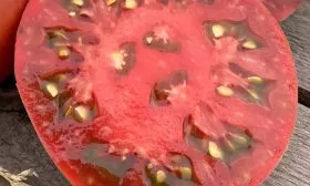 Масса каждого томата варьируется от 200 до 300 граммов. Мякоть очень плотная, мясистая, с малым количеством семян и семенных камер. На разрезе видна насыщенная красная мякоть без белых прожилок и жесткой сердцевины, что является признаком высокого содержания сухих веществ.