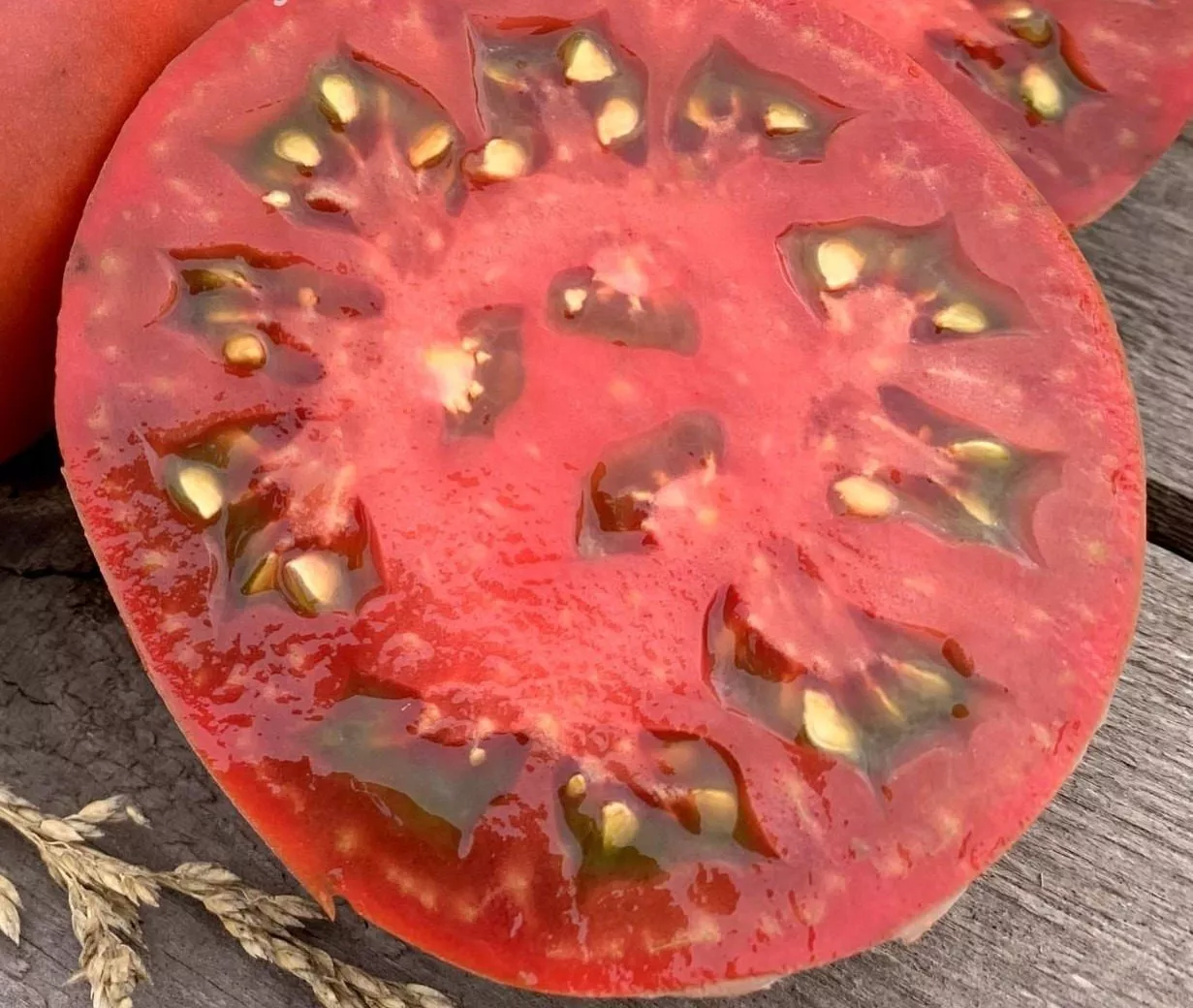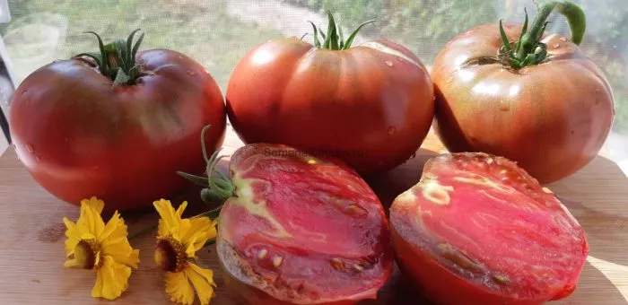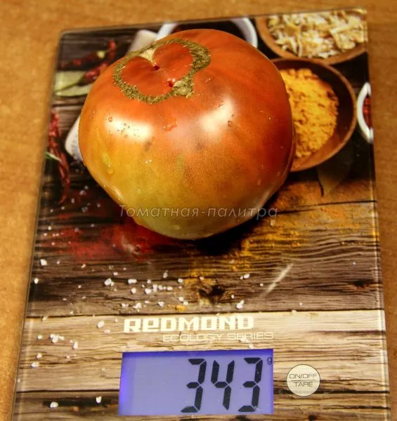 Масса каждого томата варьируется от 200 до 300 граммов. Мякоть очень плотная, мясистая, с малым количеством семян и семенных камер. На разрезе видна насыщенная красная мякоть без белых прожилок и жесткой сердцевины, что является признаком высокого содержания сухих веществ.