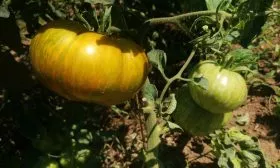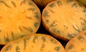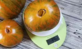 Внешность этого томата запоминается с первого взгляда, и главная его «визитная карточка» — это плоды. Их окраска не просто оранжево-желтая, а с хаотичными зелеными штрихами и пятнами у плодоножки, которые часто сохраняются даже в биологической спелости. Это не признак незрелости, а устойчивый сортовой признак, делающий каждый помидор уникальным. Форма плоскоокруглая, часто с выраженной ребристостью у основания, особенно у самых крупных экземпляров. Плоды массой от 250 до 350 граммов отличаются мясистой, плотной мякотью с небольшим количеством семян и многокамерностью.