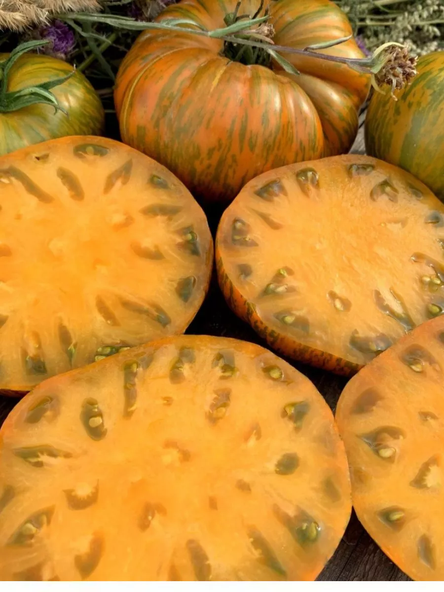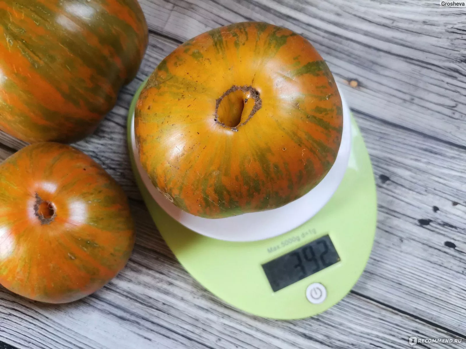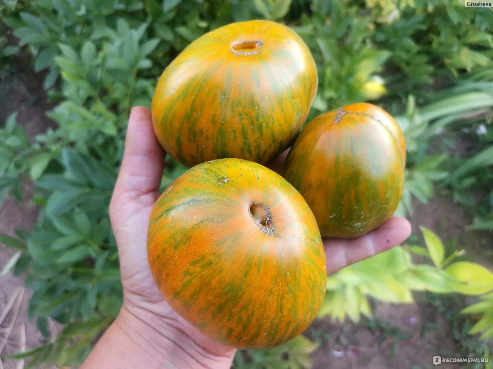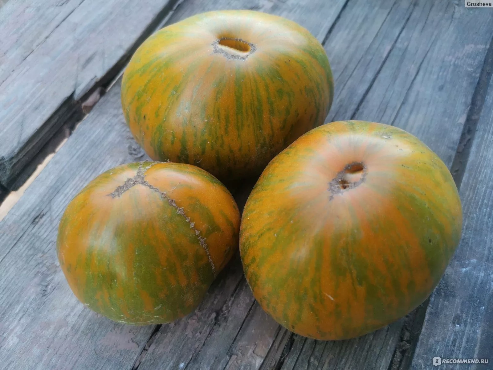 Внешность этого томата запоминается с первого взгляда, и главная его «визитная карточка» — это плоды. Их окраска не просто оранжево-желтая, а с хаотичными зелеными штрихами и пятнами у плодоножки, которые часто сохраняются даже в биологической спелости. Это не признак незрелости, а устойчивый сортовой признак, делающий каждый помидор уникальным. Форма плоскоокруглая, часто с выраженной ребристостью у основания, особенно у самых крупных экземпляров. Плоды массой от 250 до 350 граммов отличаются мясистой, плотной мякотью с небольшим количеством семян и многокамерностью.