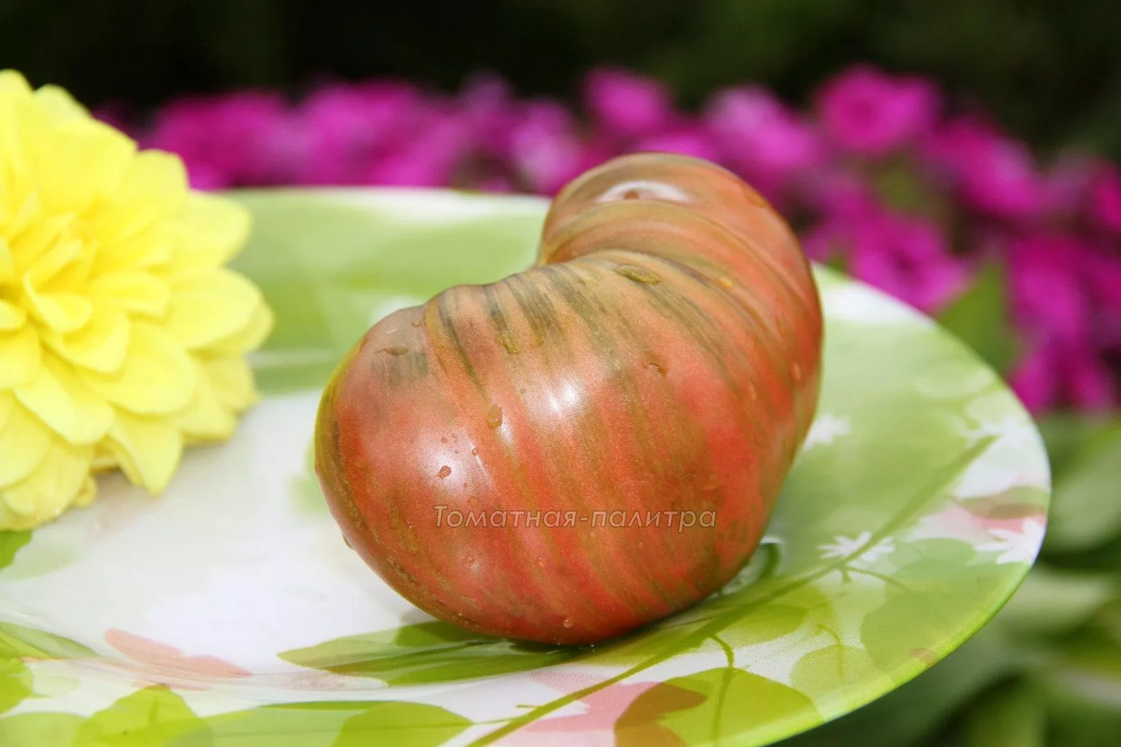 Плоды — визитная карточка сорта. Их плоскоокруглая форма с легкой ребристостью у плодоножки и солидная масса от 200 до 350 граммов производят впечатление. Однако главная отличительная черта — сложная, неоднородная окраска. В состоянии полной биологической зрелости основной фон становится глубоким бордово-коричневым, а на нем проявляются контрастные зеленые или оливковые полосы и штрихи.