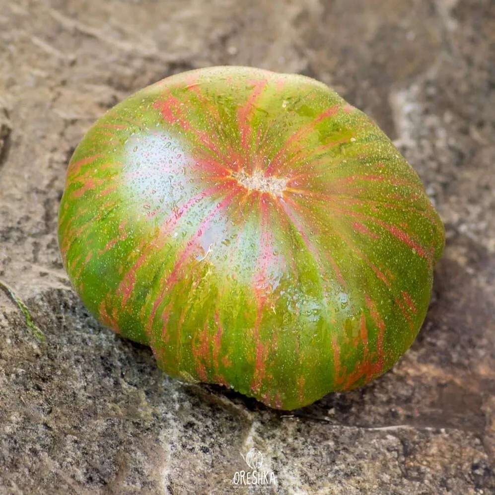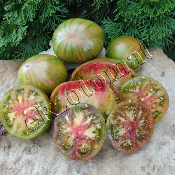Вкусовой профиль этого сорта формируется его мясистой, сахаристой мякотью с высоким содержанием сухих веществ. Классический «томатный» вкус с выраженной сладостью и легкой, приятной кислинкой делает плоды отличным выбором для свежего потребления. Их необычная окраска — розовые полосы на зеленом фоне — добавляет эстетики летним блюдам.
