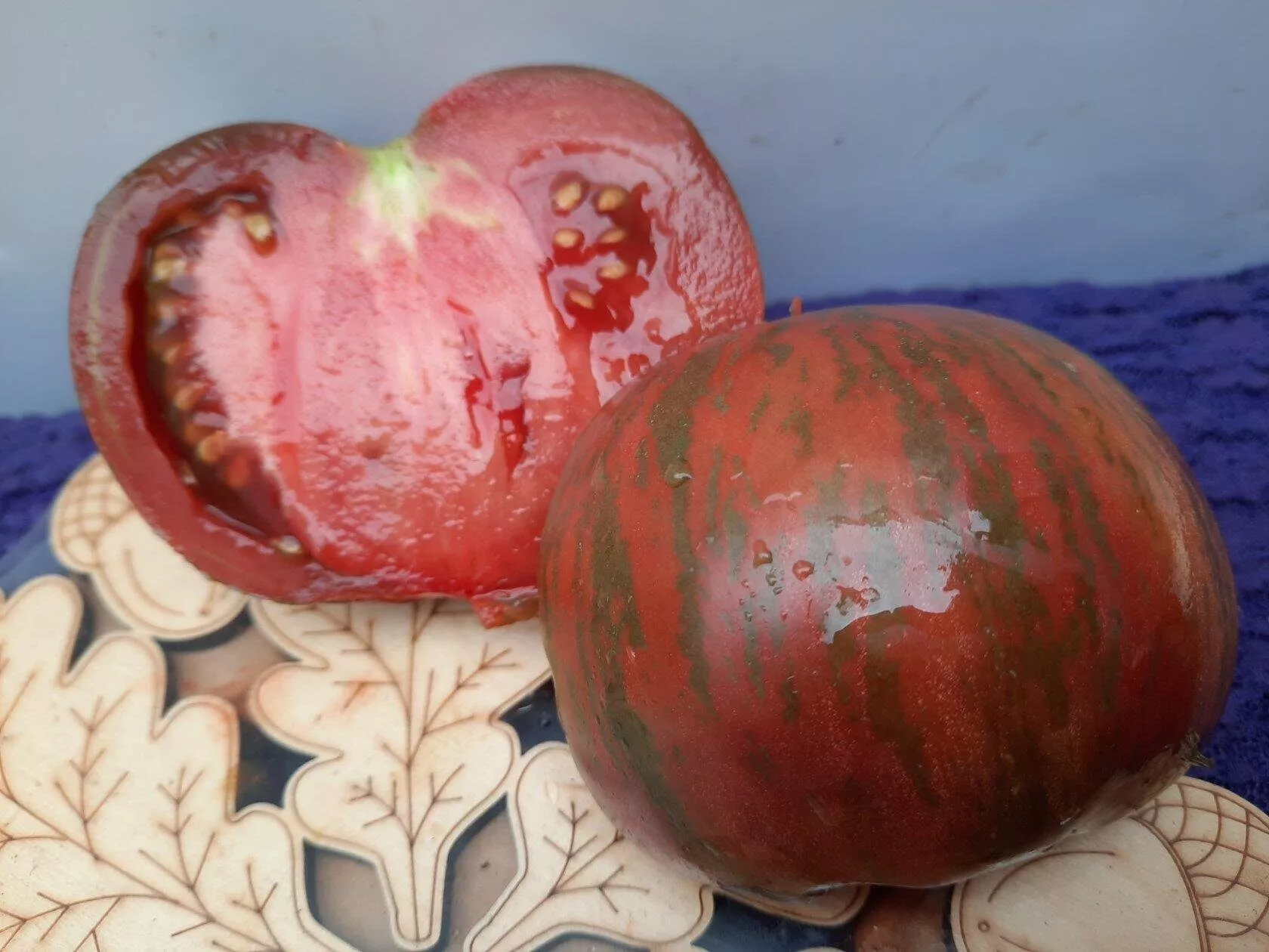 Визуальная уникальность плодов этого сорта является его главной отличительной чертой, благодаря которой его легко идентифицировать даже среди других полосатых томатов. Плоды имеют характерную плоскоокруглую форму, которая часто дополняется выраженной ребристостью в области плодоножки. Эта ребристость особенно заметна у самых крупных экземпляров.