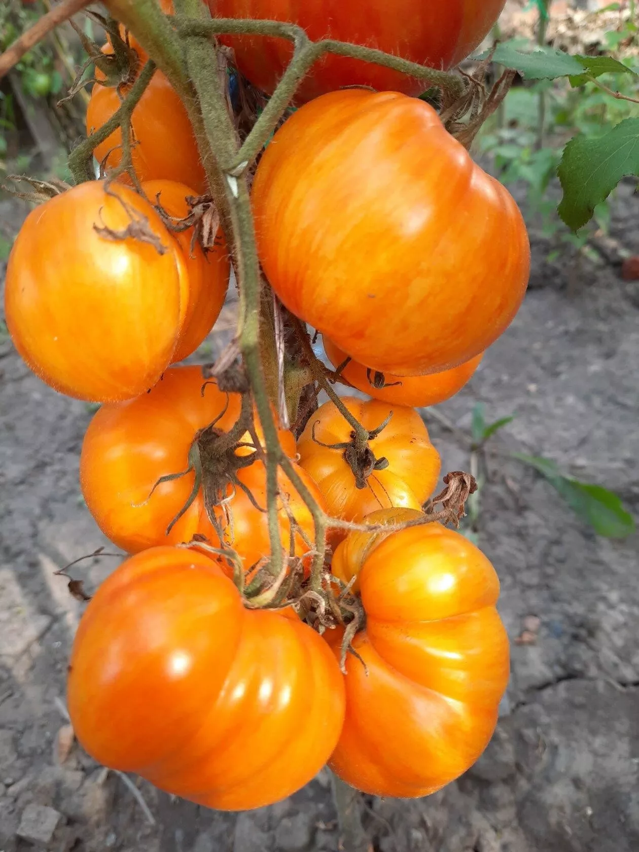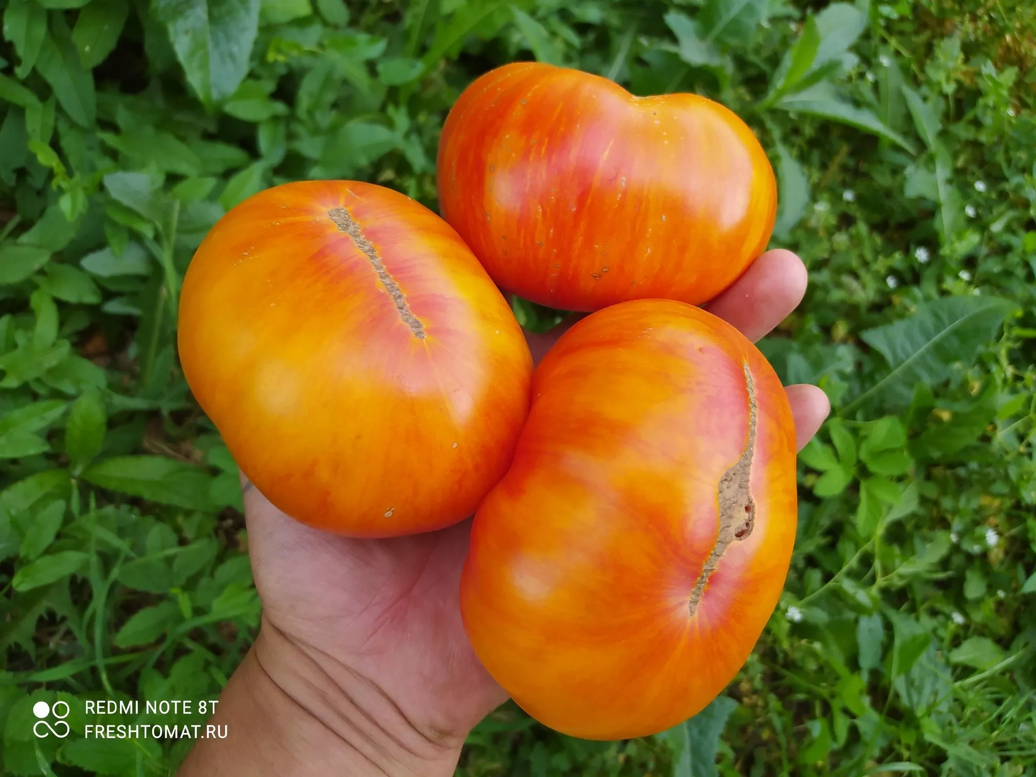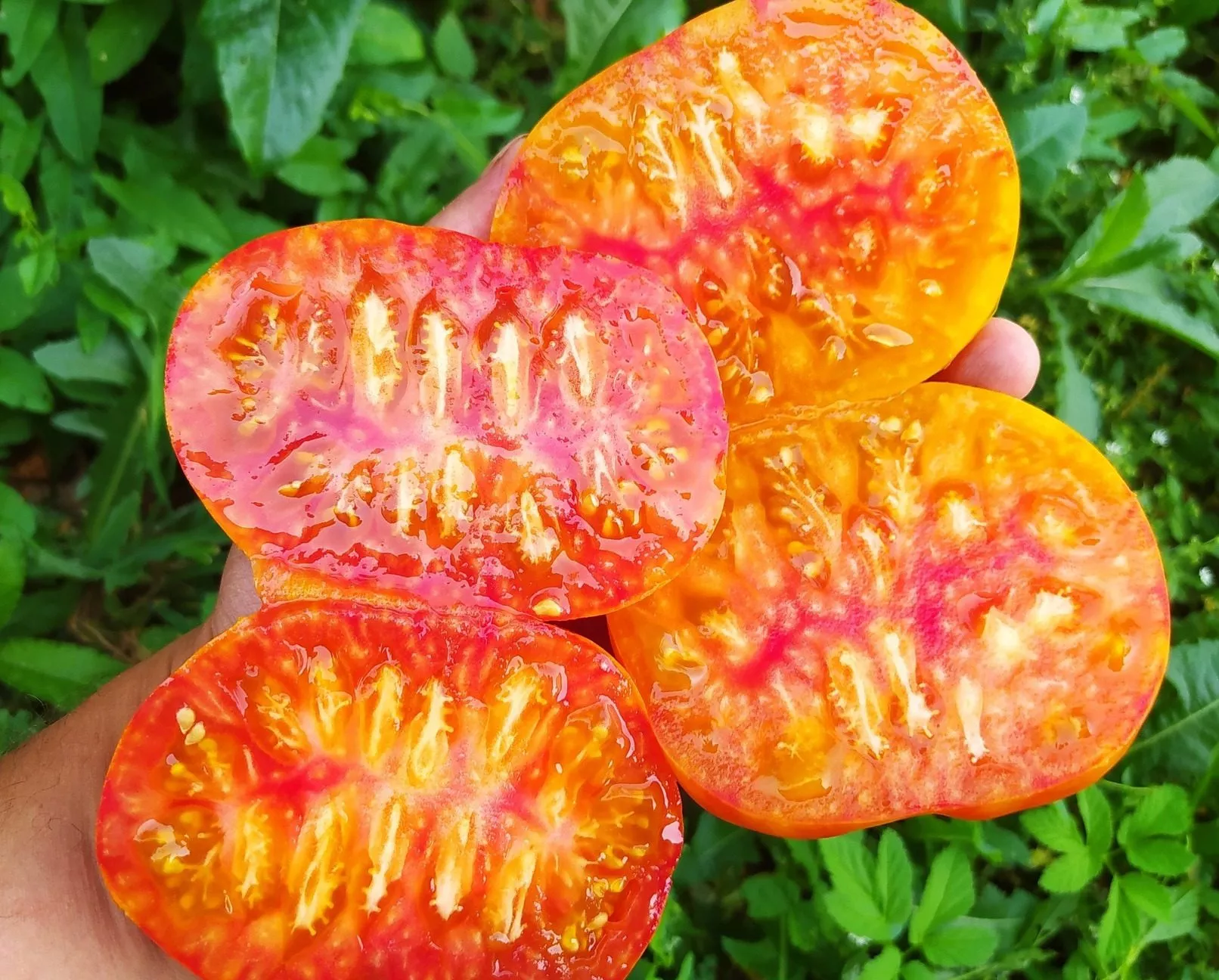 По мере созревания основной фон наливается насыщенным оранжево-красным цветом, по которому проступают неравномерные розовые штрихи, полосы и мраморные разводы. Интенсивность этого рисунка может варьироваться от плода к плоду даже в пределах одной кисти, что делает каждый помидор уникальным.