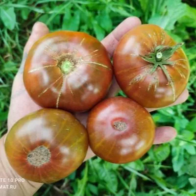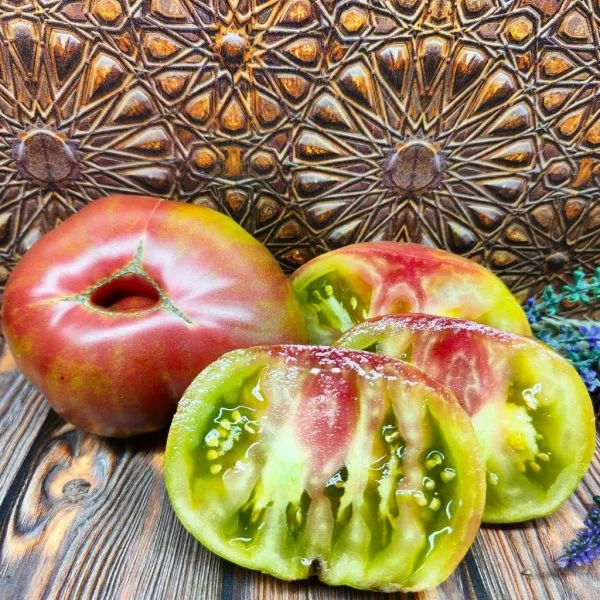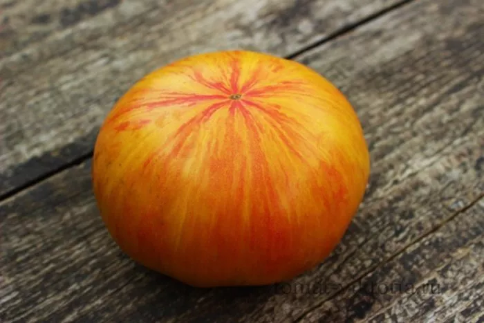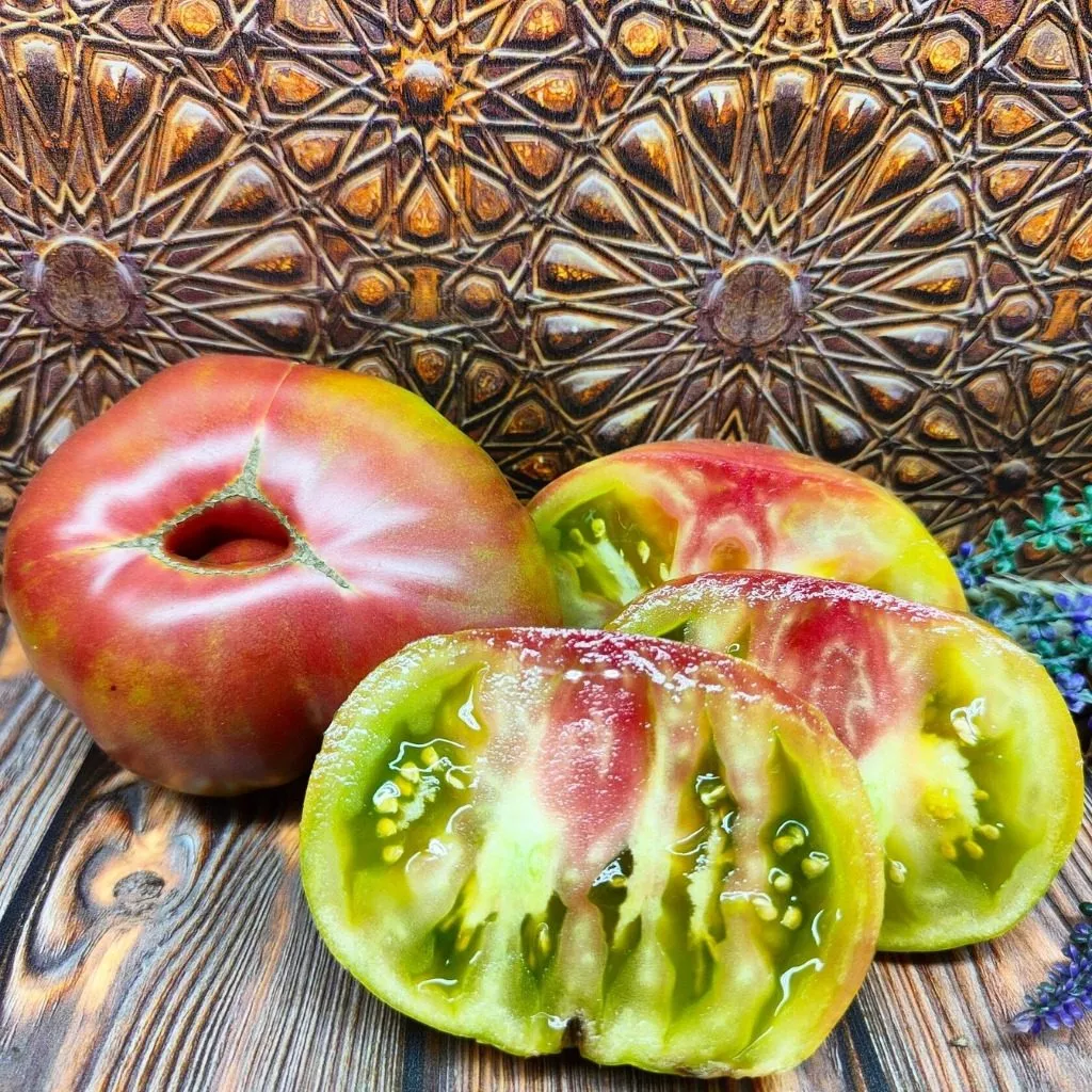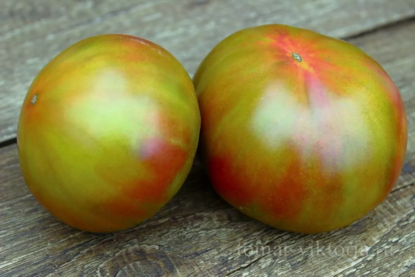 Внешний вид плодов — визитная карточка сорта, по которой его легко отличить от любого другого. Зрелые томаты имеют неоднородную желто-зеленую окраску с выраженными розовыми или малиновыми пятнами и разводами. Эта уникальная расцветка является сортовым признаком и проявляется при достижении биологической спелости.