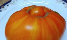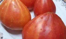 Главная гордость сорта — его плоды. Их плоскоокруглая форма часто бывает слегка приплюснутой сверху и снизу, а у плодоножки нередко проявляется заметная ребристость. Это не считается дефектом, а является сортовой особенностью многих крупноплодных томатов.