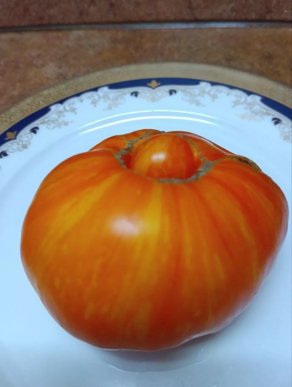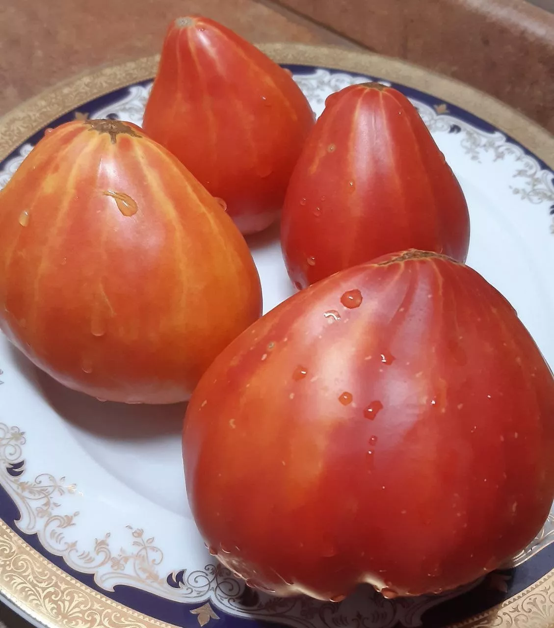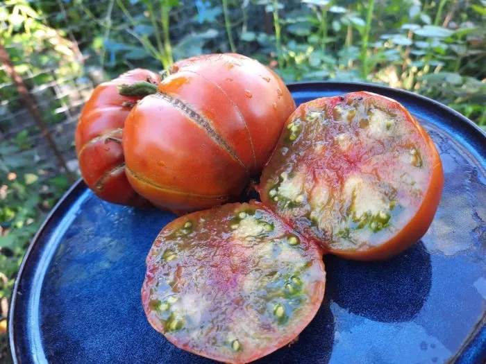 Главная гордость сорта — его плоды. Их плоскоокруглая форма часто бывает слегка приплюснутой сверху и снизу, а у плодоножки нередко проявляется заметная ребристость. Это не считается дефектом, а является сортовой особенностью многих крупноплодных томатов.