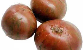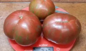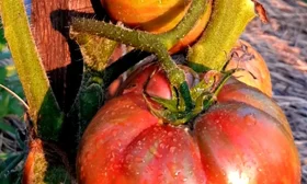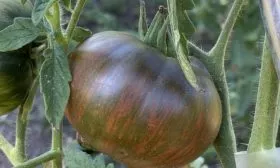 Истинная «визитная карточка» этого томата — его плоды. Их сложно спутать с любыми другими благодаря уникальной окраске. Плоскоокруглые, мясистые и увесистые, отдельные экземпляры достигают заявленных 350 граммов.