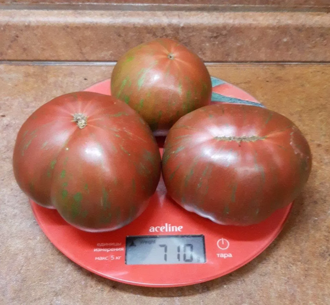 Истинная «визитная карточка» этого томата — его плоды. Их сложно спутать с любыми другими благодаря уникальной окраске. Плоскоокруглые, мясистые и увесистые, отдельные экземпляры достигают заявленных 350 граммов.
