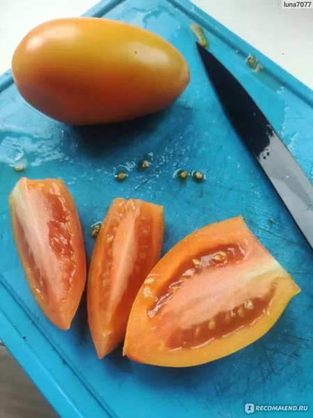 Однако ключевая «изюминка» сорта кроется в его плодах. Вопреки ожиданиям от названия, зрелые томаты имеют насыщенный оранжевый цвет, а не классический красный. Форма — аккуратная, цилиндрическая, иногда с небольшим носиком, масса в среднем составляет 80 грамм.