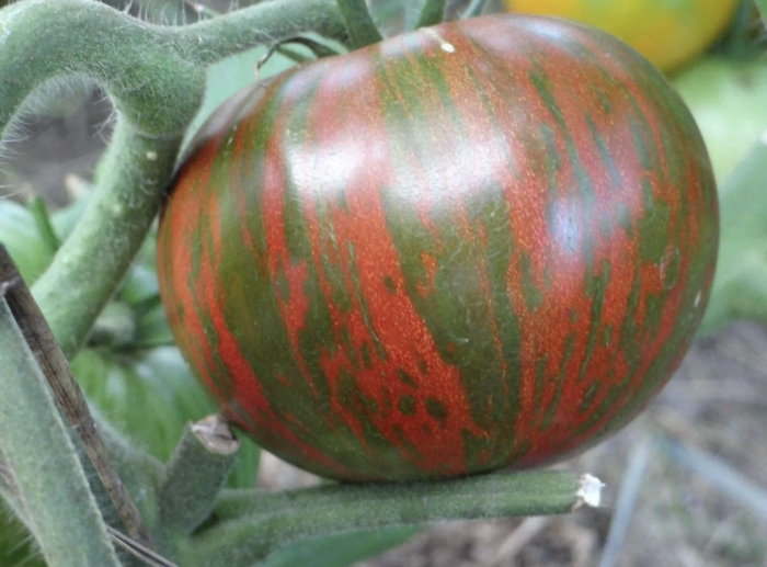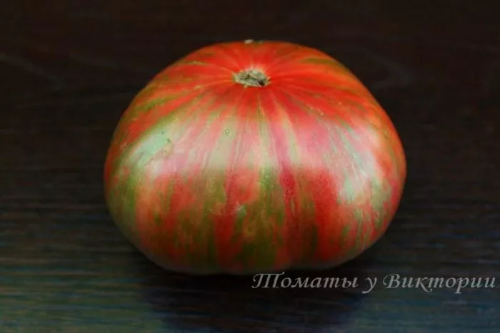 Плоды этого сорта по праву считаются его главной декоративной и гастрономической ценностью. Их окраска представляет собой сложную палитру, где на основном желто-оранжевом фоне проступают ярко-красные, а иногда и розоватые, продольные полосы и мраморные разводы. Каждый томат обладает уникальным, неповторимым рисунком, что делает сбор урожая особенно интересным.