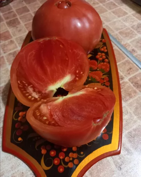 Мякоть очень мясистая, плотная и сахаристая на изломе, с небольшим количеством семян и семенных камер. Эта особенность, наряду с насыщенным вкусом, определяет его назначение: плоды отлично подходят для приготовления густых соков, соусов, паст и лечо, где важна концентрация вкуса и плотная текстура.