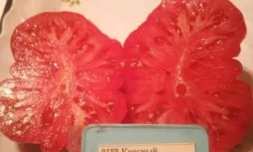 Мякоть обладает выраженной мясистостью и высокой плотностью. На разломе хорошо видна ее сахаристая, зернистая структура, характерная для биф-томатов. Семенных камер формируется немного, самих семян также мало.
