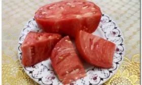 На срезе плод демонстрирует многокамерное строение с небольшим количеством семян. Мякоть очень мясистая, плотная и сочная одновременно. При разрезе заметна ее сахаристость – мякоть не водянистая, а имеет характерный зернистый, «арбузный» излом.