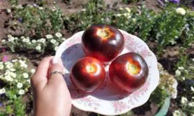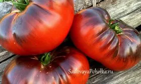 Плоды действительно невозможно спутать ни с какими другими. Их окраска — сложный градиент. Основной цвет зрелого томата — глубокий шоколадно-коричневый. Но у плодоножки, на так называемых «плечиках», проявляются крупные, насыщенные фиолетово-бордовые разводы и пятна.