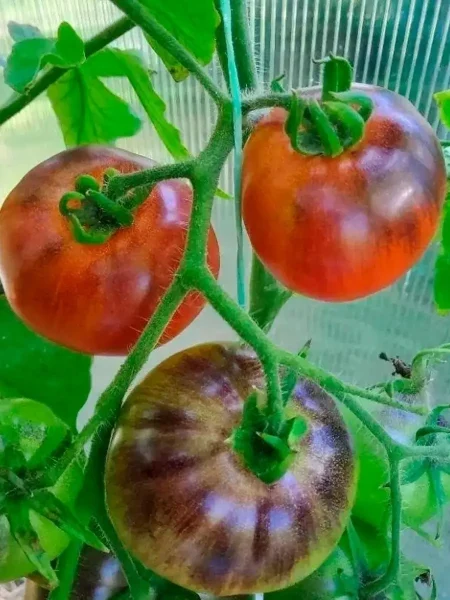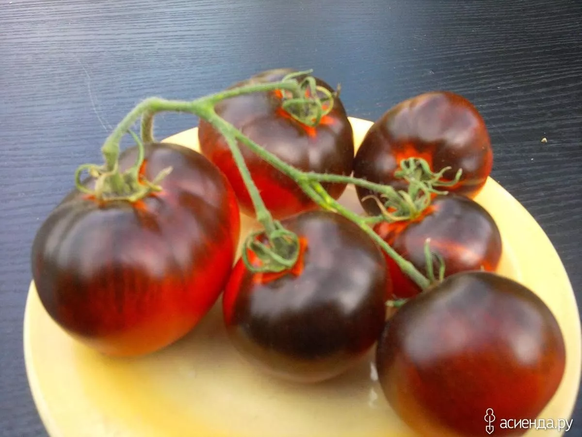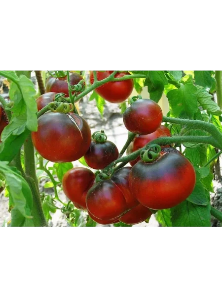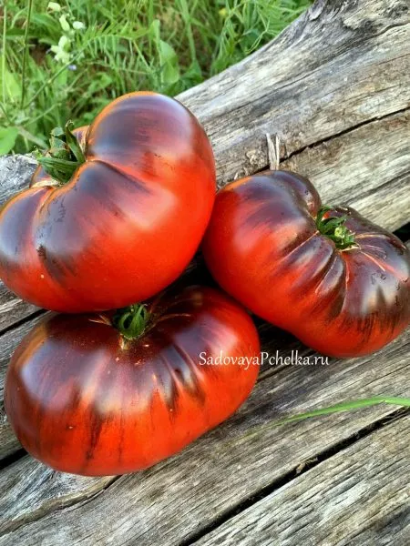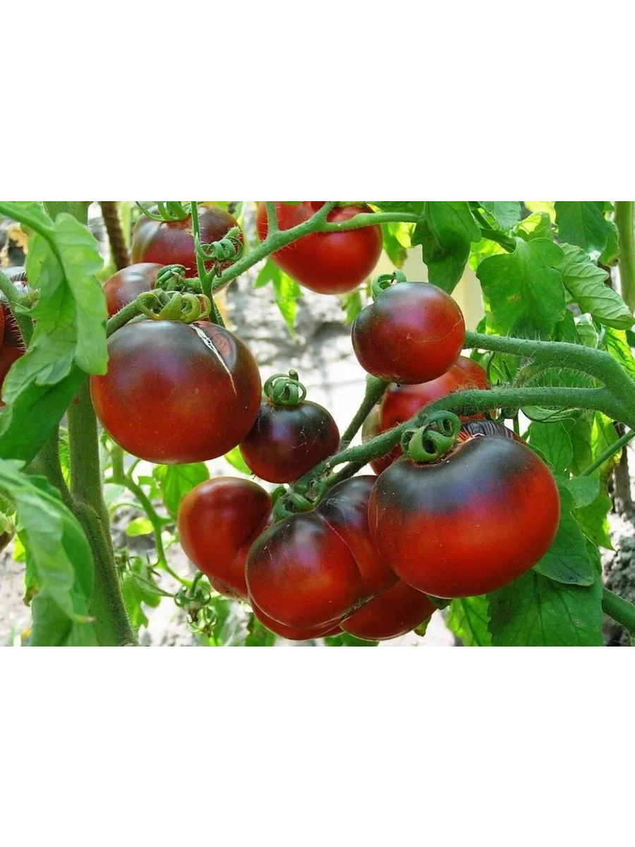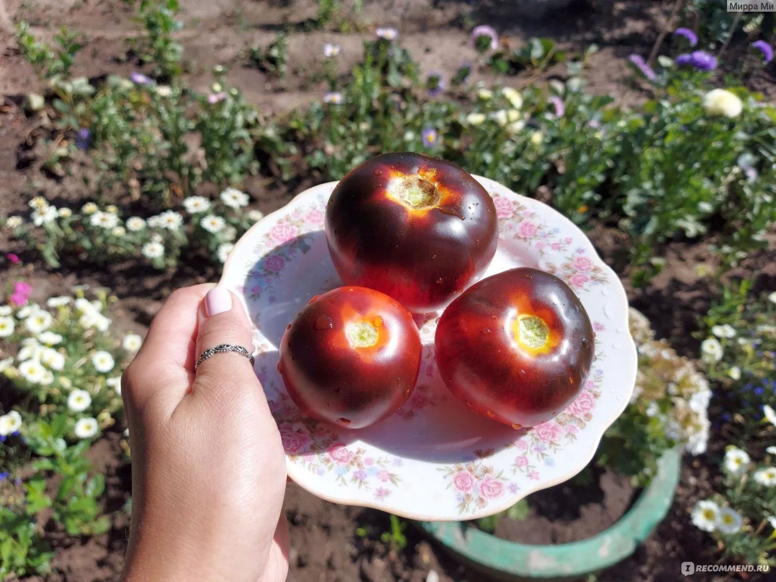 Плоды действительно невозможно спутать ни с какими другими. Их окраска — сложный градиент. Основной цвет зрелого томата — глубокий шоколадно-коричневый. Но у плодоножки, на так называемых «плечиках», проявляются крупные, насыщенные фиолетово-бордовые разводы и пятна.