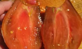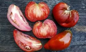 Темно-бордовая окраска в состоянии полной биологической зрелости говорит о высоком содержании антоцианов и ликопина. Такие плоды отлично подходят не только для нарезки, но и для переработки на густые соусы, пасты и соки, которые получаются насыщенного цвета и вкуса.